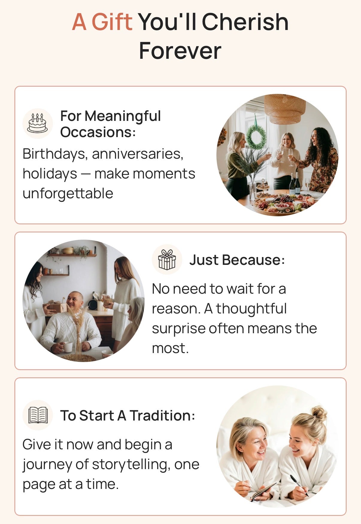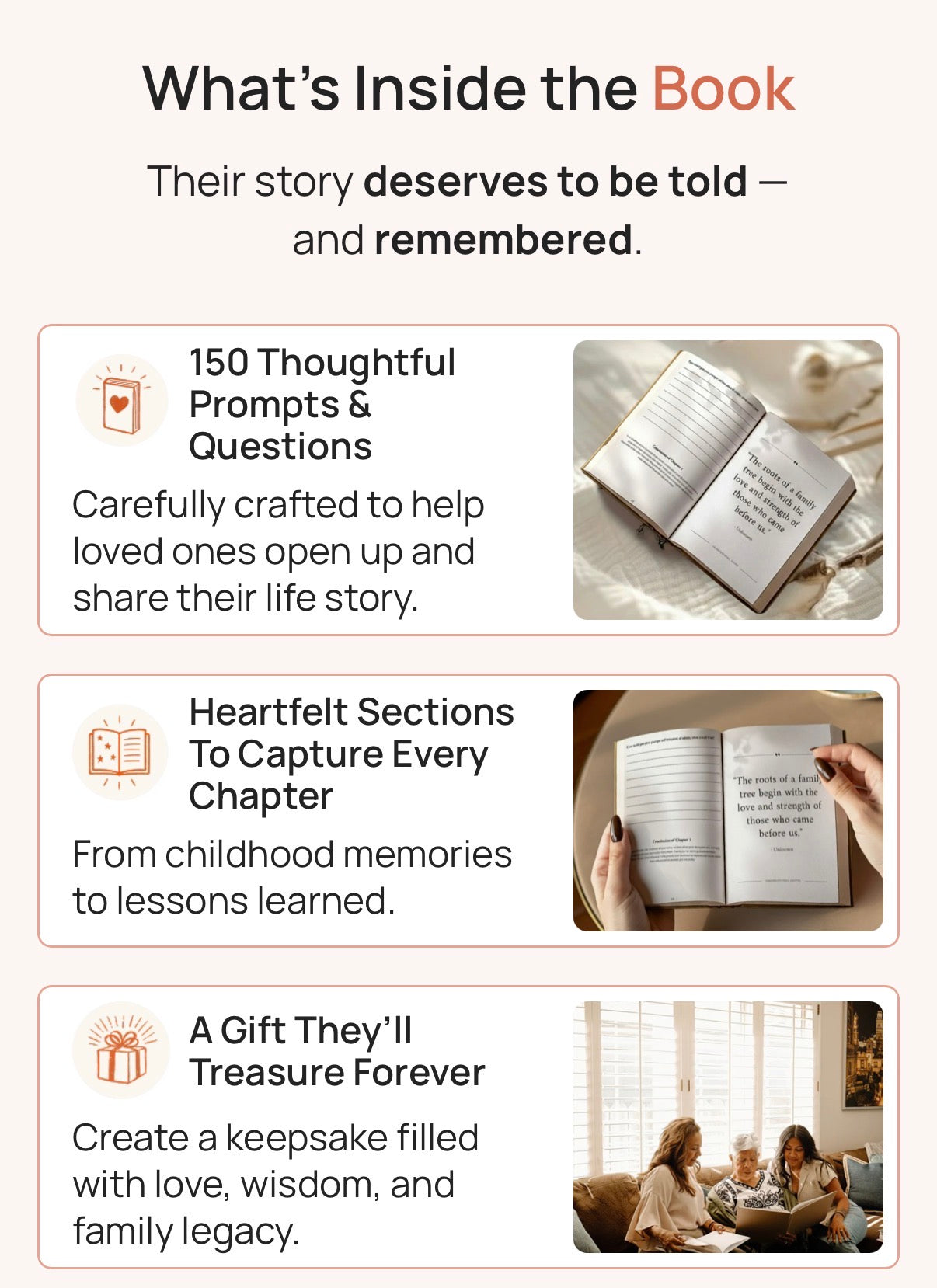 A guided memory journal with thoughtful prompts to preserve your loved one’s life stories, wisdom, and voice.